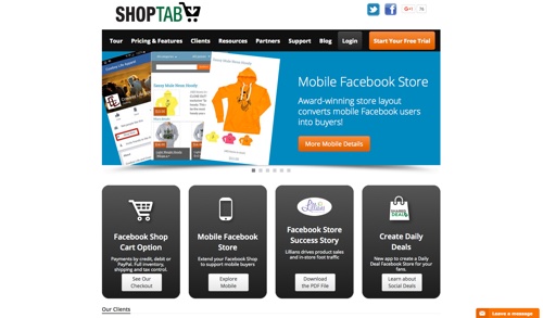 ShopTab merupakan solusi e-commerce pada halaman Facebook dengan analisis kinerja. Kamu bisa membuat kode promosi, diskon dan spesial produk untuk pelanggan. Kamu bisa dengan mudah menambahkan produk secara manual atau melalui product feed. ShopTab juga menyediakan fitur persediaan, pengiriman, dukungan pajak, dan integrasi dengan 26 mata uang dan beberapa bahasa. Untuk harga : Standard plan $10 per bulan untuk 500 produk.