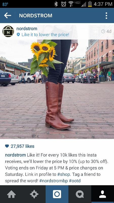 Kamu bisa melibatkan audiens dengan memberikan insentif dalam keterangan foto. Sebagai contoh, Nordstrom “Klik like untuk mendapatkan harga miring”. Bagi 10.000 like pertama akan mendapatkan potongan harga 10% hingga 30%.